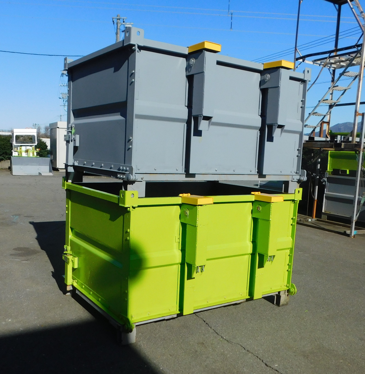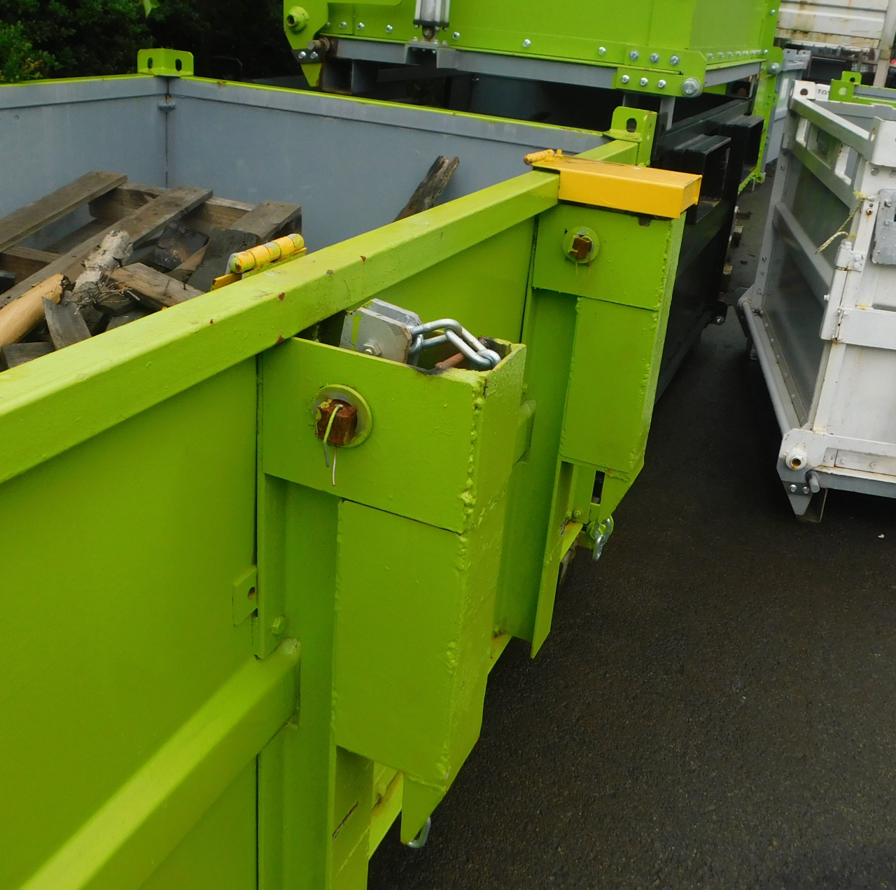 ヒンジ式(リフトの爪が前に傾く事)フォークリフト仕様です! 空中で何度も開閉出来ます。 リフトを大体の位置でコンテナと取付ます。リフトを動かすと自動で コンテナが定位置にセットされます☺